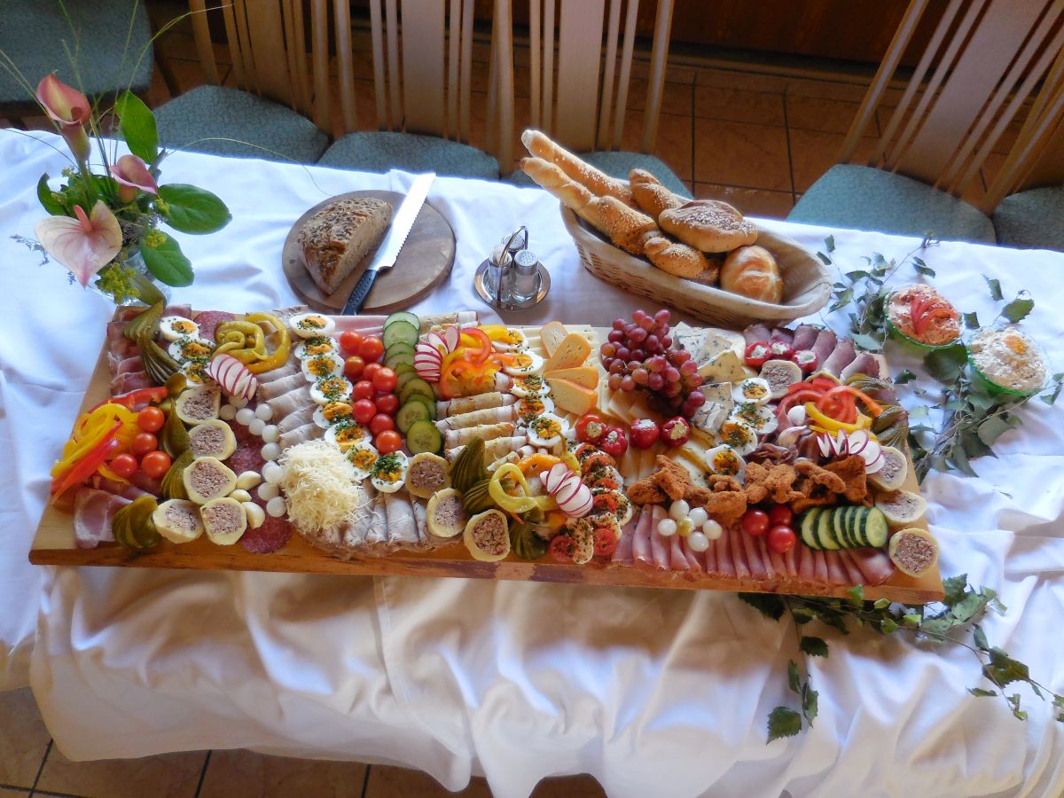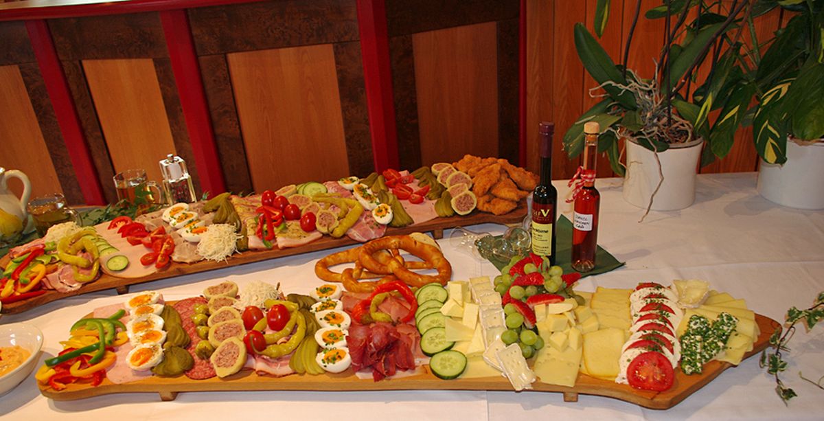 The original “Mostviertler Meterjause” this is a snack with spread, bacon, joint of pork, slices of sausage, ham, several cheeses, meatballs, escalope and vegetables.